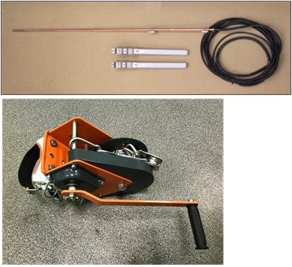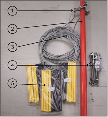 Базовый комплект состоит из одного комплекта тросовых растяжек. Верхний зажим для тросовых растяжек закрепляется на верхней трубе во время установки мачты. Базовая поставка состоит из комплекта тросовых растяжек и приспособлений к ним, как представлено на Рисунке "Базового комплекта монтажа"